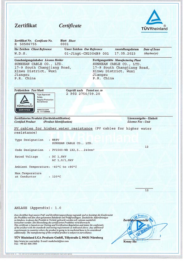 2 PfG/2750 태양광 케이블 인증서
