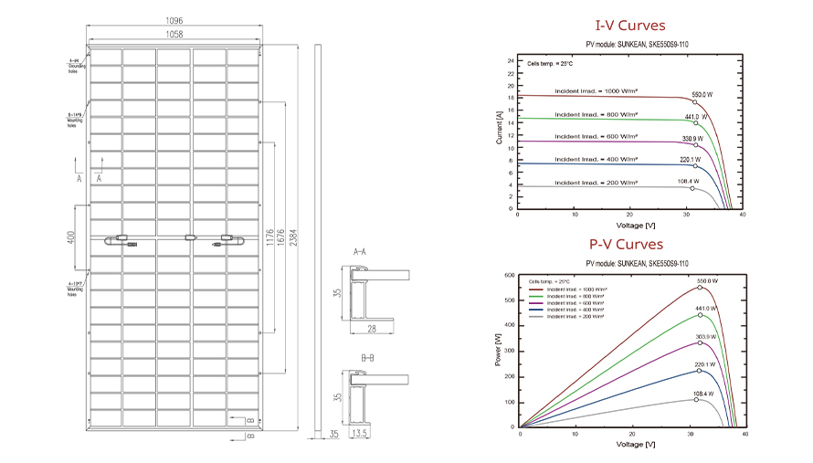 NMOT: 조도 800 w/m2 , 주변 온도 20°C, AMu003d1.5, 풍속 1m/s.