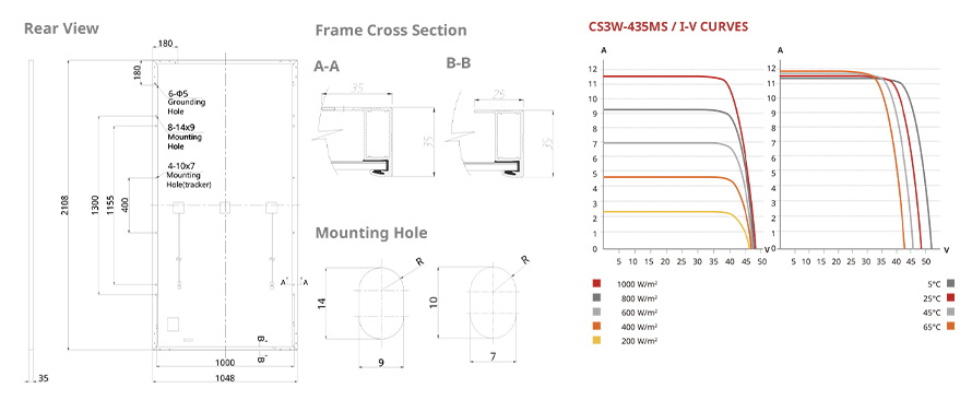 * NMOT(Nominal Module Operating Temperature), 조도 800W/m2, 스펙트럼 AM 1.5, 주변 온도 20°C, 풍속 1m/s에서.