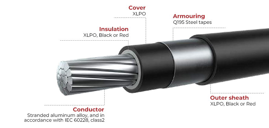 할로겐 프리. UV 방지 저전압 케이블. TÜV2642 알루미늄 케이블은 특히 옥외 적용 및 땅에 직접 매설하는 데 매우 적합합니다.