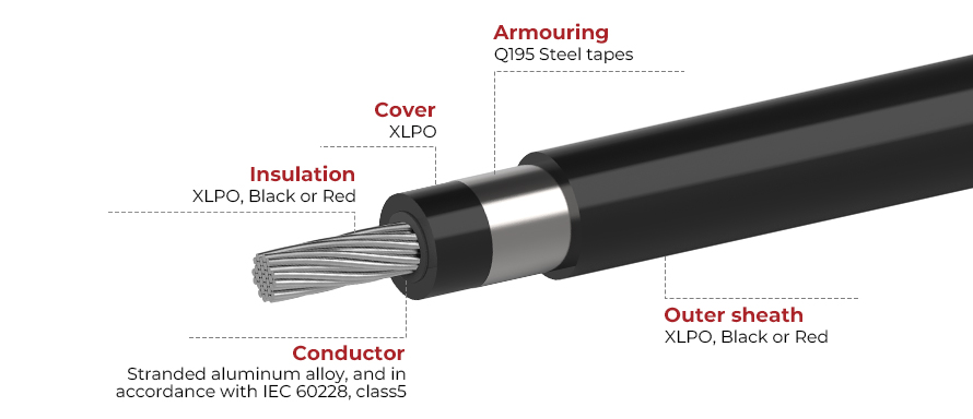할로겐 프리. UV 방지 저전압 케이블. TÜV2642 알루미늄 케이블은 특히 옥외 적용 및 땅에 직접 매설하는 데 매우 적합합니다.