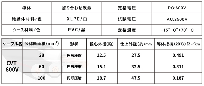 CVT 케이블("가교폴리에틸렌절연비닐시스케이블"의 약칭)은 JIS 규격품으로 전력케이블에 단심 CV케이블을 연선한 것으로 저전압부터 모든 전력의 송배전용으로 사용됩니다. 고전압에.