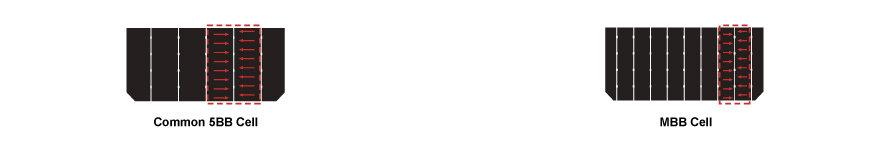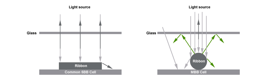 일반 5BB 모듈과 비교, MBB 모듈은 원형 리본을 사용하여 음영 영역을 줄이고 입사광을 반복적으로 반사하여 발전력을 향상.