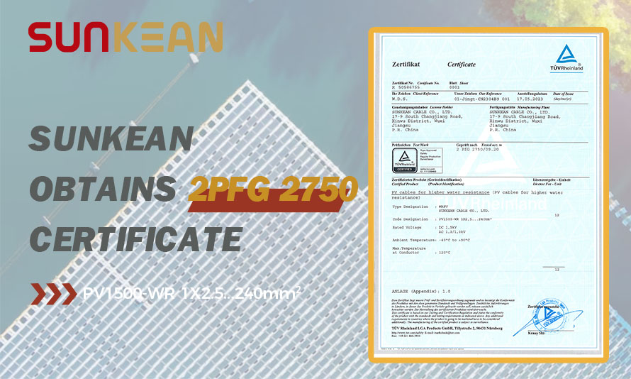 2023년 5월 24일 제16회 국제 태양광 및 스마트 에너지 컨퍼런스 및 전시회(SNEC)에서 TUV Rheinland는 SUNKEAN에 플로팅 태양광 케이블 2 PfG 2750 표준 인증을 발급했습니다. SUNKEAN은 부유식 태양광 케이블의 R&D 및 제조 분야에서 업계 선두를 달리고 있습니다 . 항상 태양광 산업의 발전과 태양광 응용 분야의 다양화를 돕고 산업 표준화 프로세스를 적극적으로 추진하는 데 전념해 왔습니다.