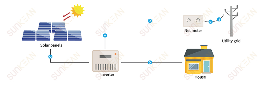 온 그리드(on-grid) 또는 그리드 타이(grid-tie) 태양광 시스템은 가정과 기업에서 가장 일반적이며 널리 사용됩니다. 이러한 시스템은 배터리가 필요하지 않으며 태양광 인버터 또는 마이크로 인버터를 사용하며 공공 전력망에 연결됩니다[4 ] 생성한 초과 태양광 발전은 전력망으로 내보내지며 일반적으로 에너지 수출에 대한 보조금(적합) 또는 크레딧을 받습니다..