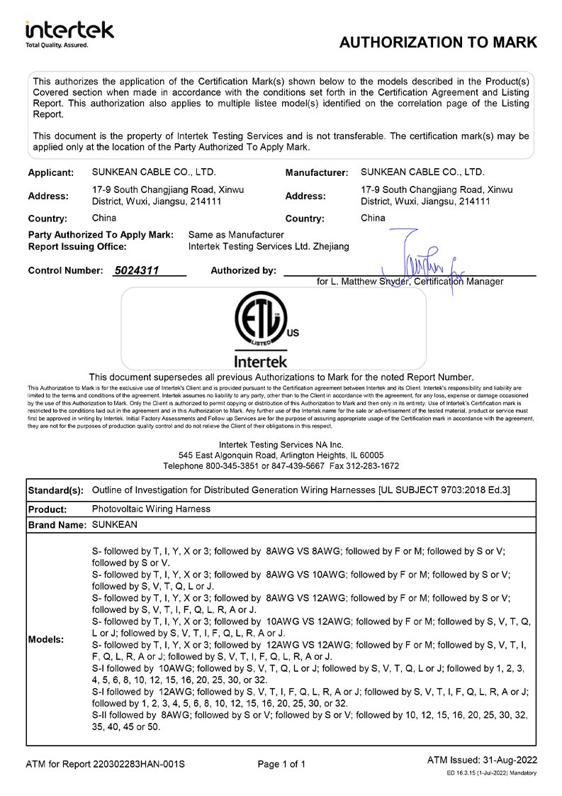 최근 SUNKEAN의 Photovoltaic Wiring Harness 제품 은 Intertek Intertek Group의 테스트를 성공적으로 통과하고 인증 프로세스를 완료했으며 Intertek ETL 인증을 받았습니다. ETL 인증 획득은 SUNKEAN 태양광 배선 하니스 제품이 북미 시장에 진출할 수 있는 신뢰할 수 있는 제3자 제품 품질 인증서를 제공하여 구매자가 제품 품질 데이터를 더 쉽게 수락할 수 있도록 합니다.