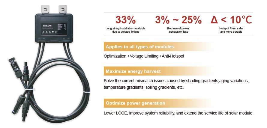 sunkean의 PV 모듈 외부 옵티마이저는 어레이의 각 태양 전지판 후면에 부착할 수 있습니다. 태양계,의 방향에 관계없이 태양계,의 각 패널 성능을 최적화합니다, 그늘, 또는 하나 이상의 패널에 손상을 입힘.