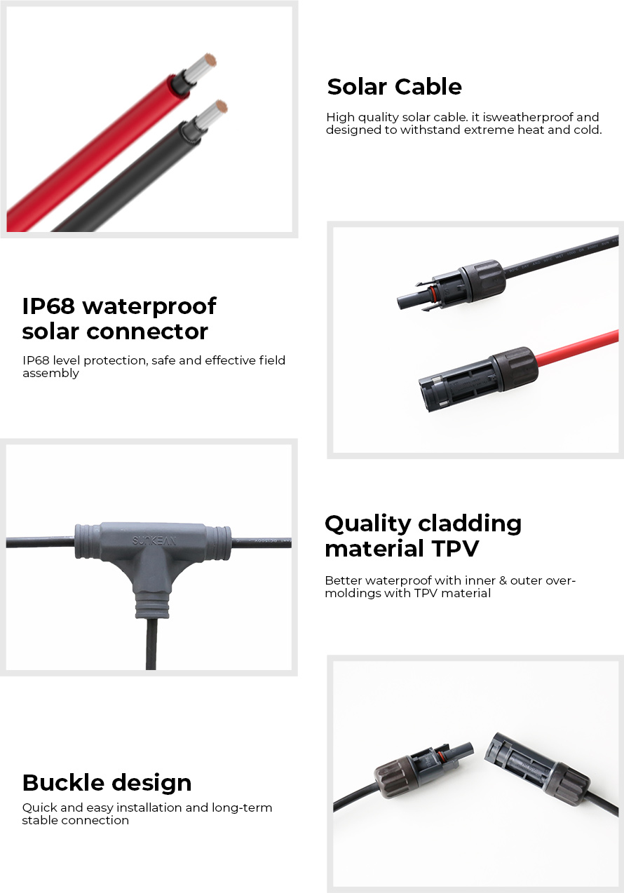 SUNKEAN T 브랜치 하네스는 IP68 방수 등급을 갖추고 있으며 -40°C ~ +90°C의 넓은 작동 온도 범위에서 사용할 수 있습니다. 낮은 접촉 저항과 높은 전류 전달 능력은 높은 제품 효율성을 보장합니다.