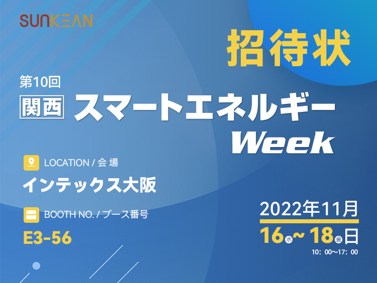 2022년 11월 16일부터 11월 18일까지 일본 오사카 INTEX 국제전시센터에서 World Smart Energy Week OSAKA 2022가 개최되며, 예정대로 SUNKEAN 이 참가합니다.
