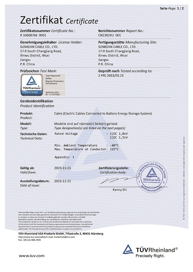 SUNKEAN의 에너지 저장 와이어가 2019년에 발표된 버전보다 더 최적화된 새로운 TÜV 인증인 2 PfG 2693/03.23 에 도달했음을 발표하게 되어 기쁘게 생각합니다 .
